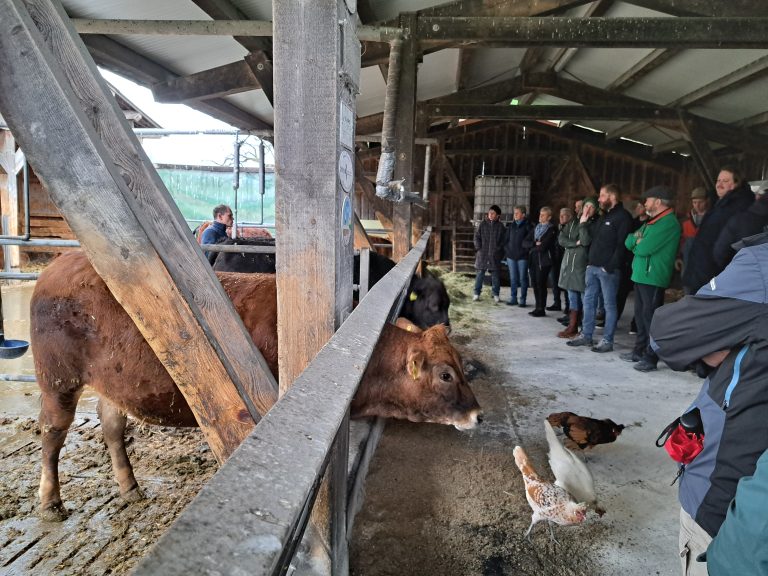 Um 08:00 Uhr startete der Ausflug mit über 40 gutgelaunte Teilnehmer:innen in die Schweiz. Nach einer ca. 1,5 h Busfahrt haben wir den Betrieb Kabier in Stein im Appenzell erreicht. Das Besondere ist, dass die Tiere mit dem Abfallprodukt der Bierherstellung einmassiert und gefüttert werden. Sepp Dähler erklärt uns, dass er so den regionalen Kreislauf einhalten kann. Er produziert Braugerste für die Brauerei. Von der Brauerei kann er wiederum kostengünstig die Bierhefe bzw. Treber beziehen. Auf dem Acker der Braugerste werden im Sommer Schweine gehalten, die den Acker bearbeiten und den Boden düngen. Alle Tiere werden auf dem Hof geschlachtet, so werden möglichst wenig Stresshormone gebildet und das Fleisch verliert nicht an Qualität. Das Fleisch wird bis zu 5 Wochen gelagert, ehe es zu 5 kg Mischpaketen abgepackt wird. Der Betriebsführer ist bemüht nach dem Prinzip „from nose to tail“ alles von den Rindern weiterzuverarbeiten.